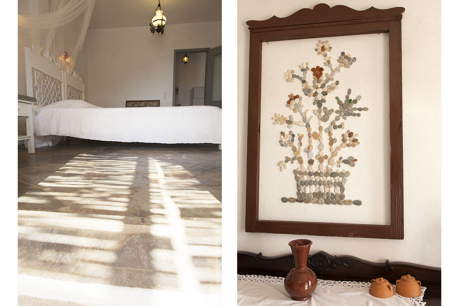 Η διακόσμηση ακολουθεί το αυθεντικό κυκλαδίτικο ύφος, με λευκές επιφάνειες, πλακόστρωτο δάπεδο, καμάρες και χειροποίητες λεπτομέρειες, δημιουργώντας ζεστή και φιλόξενη ατμόσφαιρα.