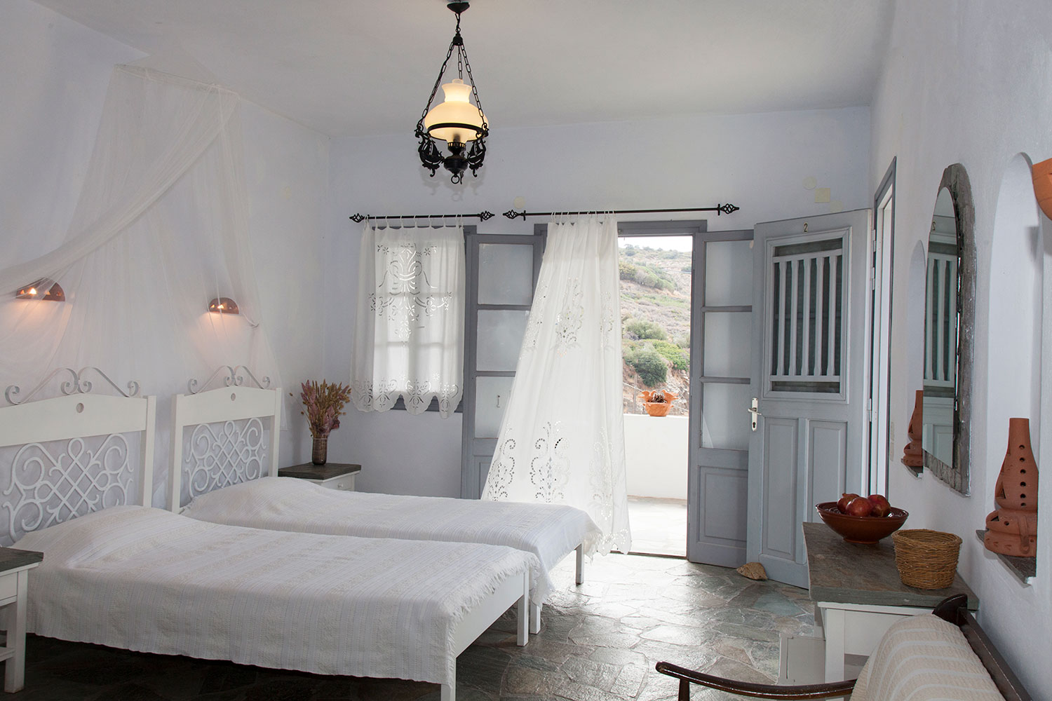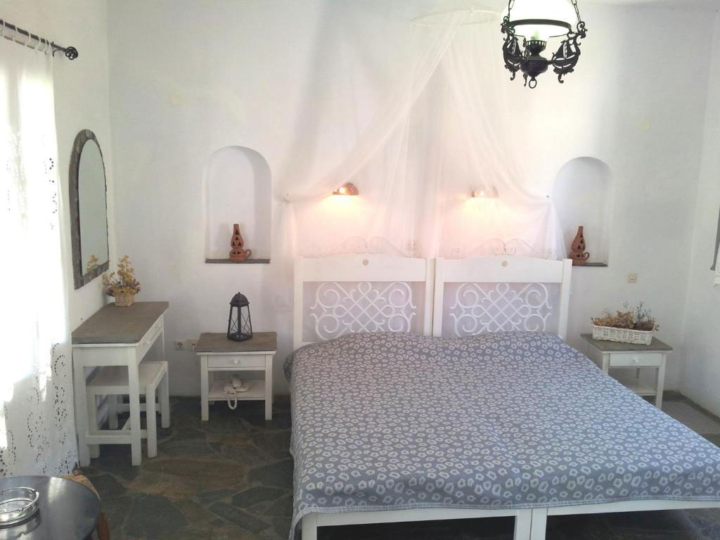 Ο φωτεινός ενιαίος χώρος διαθέτει δύο άνετα κρεβάτια, παραδοσιακή διακόσμηση, πλακόστρωτο δάπεδο και προσεγμένες λεπτομέρειες που δημιουργούν αίσθηση χαλάρωσης. Όλα τα δίκλινα στούντιο προσφέρουν θέα στη θάλασσα ή στον κήπο και φυσικό φως.