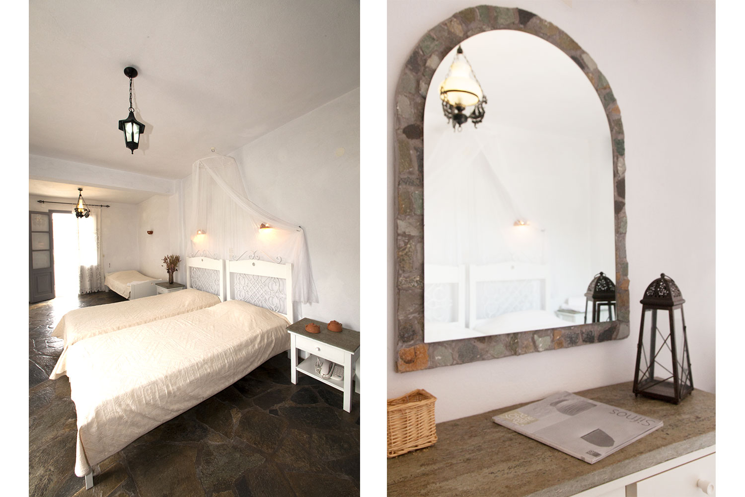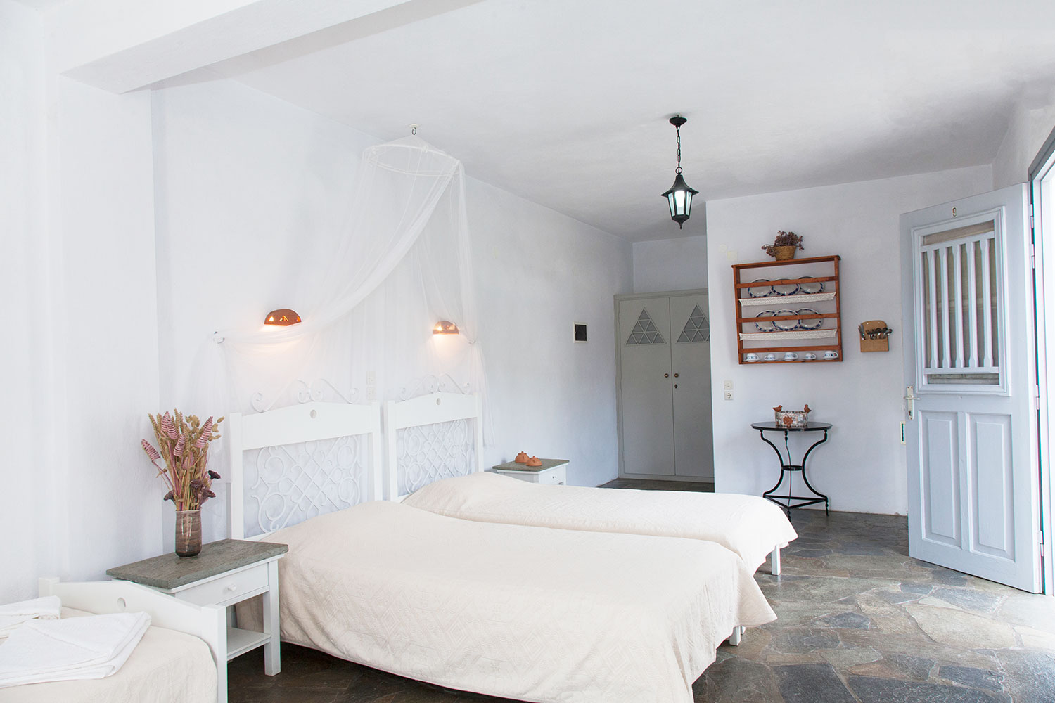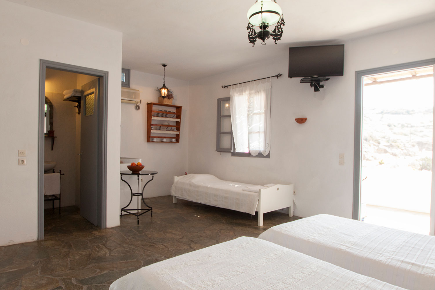 Ο ενιαίος χώρος είναι ευρύχωρος και φωτεινός, με προσεγμένη κυκλαδίτικη διακόσμηση, πέτρινα δάπεδα και παραδοσιακές λεπτομέρειες. Η διάταξη των κρεβατιών προσφέρει άνεση και ευελιξία, χωρίς να χάνεται η αίσθηση ηρεμίας και ξεκούρασης.